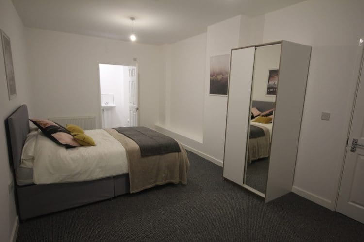 The room is fully furnished with bed, wardrobe and storage with an en suite bathroom containing a large shower enclosure, toilet and wash basin.