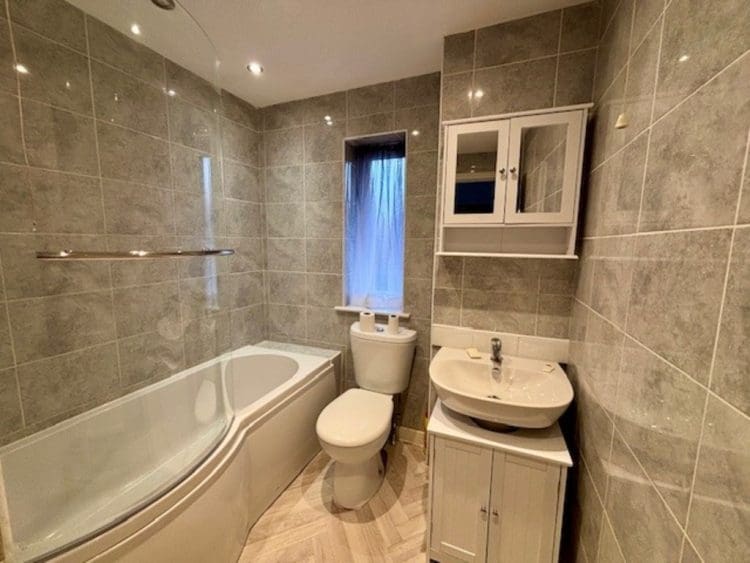 The bathroom is excellent and has modern grey tilling and new bath suite.